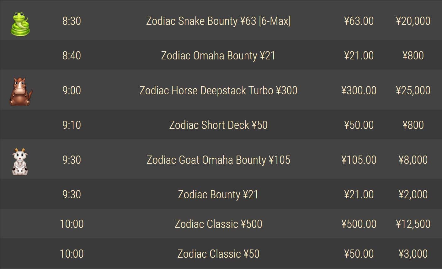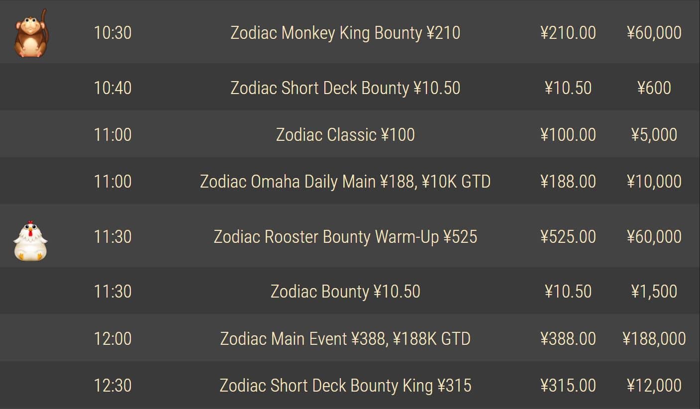 Chinese Zodiac – это специальные турниры, созданные для тех, кто хочет испытать свои силы в покере и при этом выиграть крупные деньги. Турниры проводятся ежедневно, с понедельника по субботу, с бай-ином в 388 юаней и гарантированным призовым фондом в 188 тысяч юаней. Кроме того, каждое воскресенье начинается главное событие серии – Zodiac Main Event с аналогичным бай-ином, но с повышенным гарантированным призовым фондом в 258 тысяч юаней.